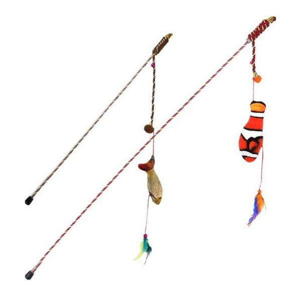 این اسباب بازی شبیه قلاب ماهیگیری سایز 70 سانتی متر طراحی شده است که گربه را تحریک به پریدن، فعالیت و تحرک میکند و برای گربه های دارای اضافه وزن بسیار مطلوب است. این اسباب بازی بسیار زیاد مورد علاقه گربه ها است زیرا حس شکار را در آنها تقویت میکند