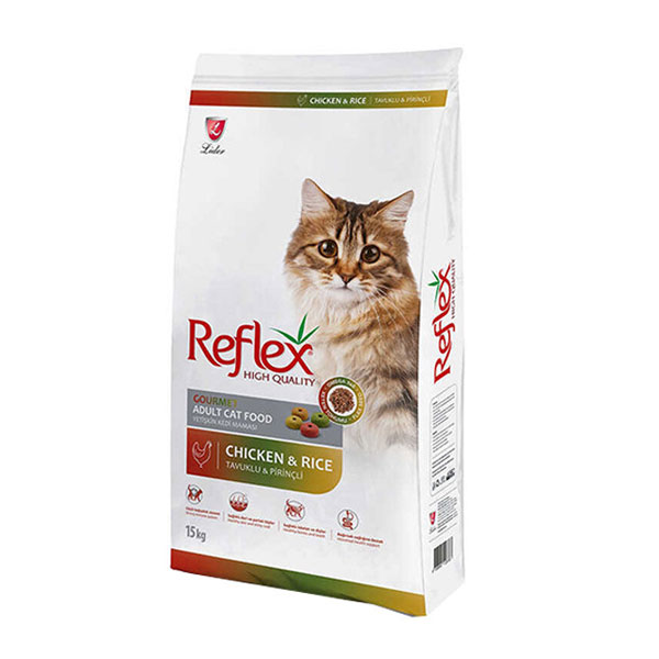 غذای خشک گربه بالغ رفلکس حاوی گوشت مرغ و برنج و برای رفع نیازهای گربه ها متعادل شده است. غذای گربه رفلکس غذایی کامل و لذیذ با مزه خوب مرغ که پروتئین مورد نیاز بدن بچه گربه ها را به طور کامل تامین می کند.