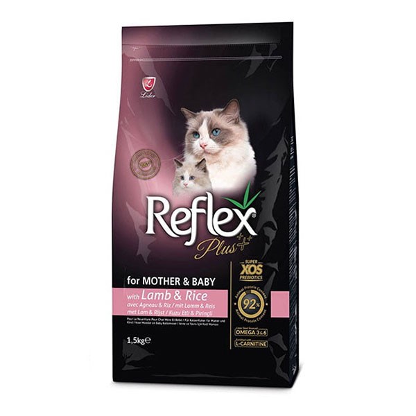 غذای خشک گربه رفلکس پلاس (mother and baby (Reflexplus با طعم بره ، یک تغذیه مخصوص مناسب برای نیاز های تغذیه ای مادر و بچه هایش تولید میشود. در دوران بارداری و شیردهی گربه های مادر نیاز به غذایی دارند که تمامی خواسته های بدن آنها را برآورده کند. بچه گربه ها نیز بعد از 4 هفتگی ، به رژیم غذایی احتیاج دارند که در دوره حساس از شیر گرفتن تا وقتی که به غذای جامد عادت میکنند ، این گونه را تقویت کند.