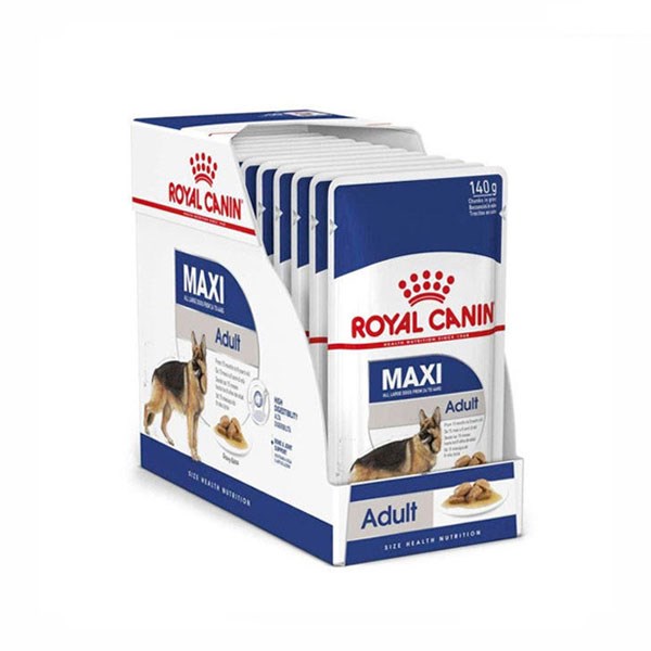 پوچ مکسی ادالت رویال کنین یا Maxi Adult Wet برای سگ های بالغ نژاد بزرگ 15 ماهه تا 8 ساله با وزنی بین 26 تا 44 کیلوگرم تولید شده است.