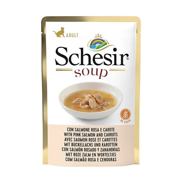 پوچ گربه شسیر با طعم ماهی سالمون صورتی و هویج در سوپ - وزن (85 گرم)