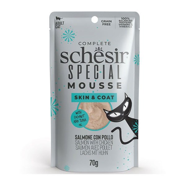 پوچ گربه شسیر تقویت پوست و مو طعم مرغ و سالمون در موس - وزن (70 گرم)