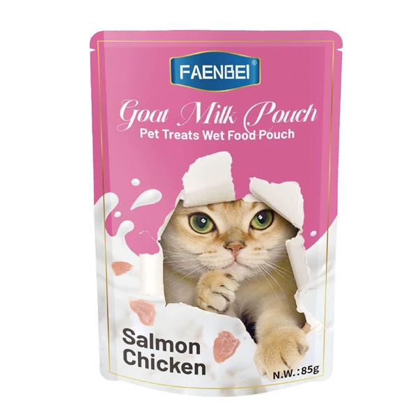 پوچ گربه فنبی مدل تیکه ای طعم مرغ و سالمون در شیر بز - وزن (85 گرم)
