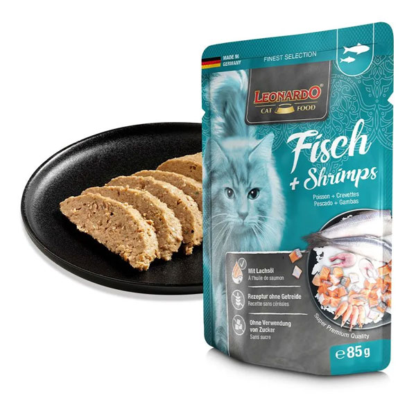 پوچ گربه لئوناردو با طعم ماهی و میگو - وزن (85 گرم)