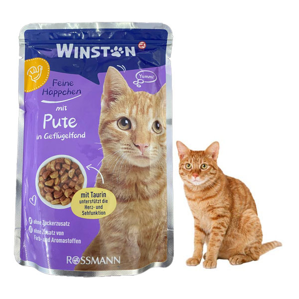 پوچ وینستون با طعم بوقلمون قرار گرفته در آب طیور برای گربه های بالغ تولید شده است. این محصول غنی از ویتامین E و D3 بوده و محصولی کامل و مغذی می باشد.