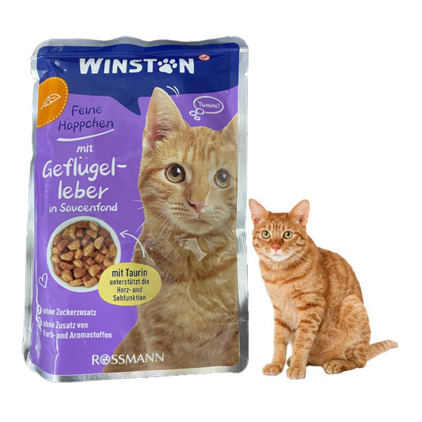 پوچ گربه وینستون طعم جگر پرنده در سس برای گربه های بالغ بد غذا تولید شده؛ غنی از تورین و بیوتین و فاقد قند، رنگ و مواد نگهدارنده است.