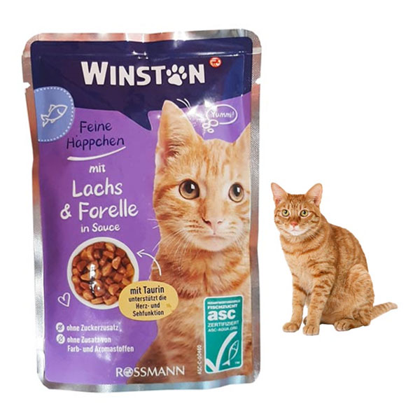 پوچ خورشتی گربه وینستون با طعم دلچسب ماهی سالمون و قزل آلا تولید شده و برای سنین 12 ماه به بالا قابل استفاده است. این محصول حاوی بیوتین بوده و به سلامت پوست کمک می کند.
