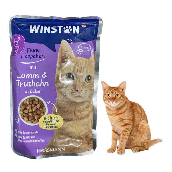پوچ گربه وینستون با طعم بره و بوقلمون به صورت ژله ای غنی از تورین و بیوتین و فاقد رنگ و نگهدارنده بوده و برای گربه های بالغ تولید شده است.