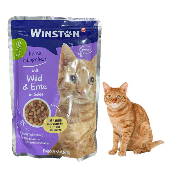 پوچ گربه با طعم گوشت شکاری و اردک وینستون برای گربه های بالغ تولید شده و حاوی تورین، بیوتین، انواع مواد معدنی و ویتامین هاست.
