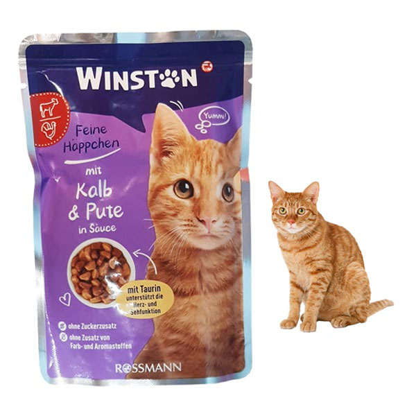 پوچ گربه وینستون با طعم گوشت گوساله و بوقلمون که به صورت ژله ای تولید شده، برای گربه های بالغ مناسب بوده و با تورین و بیوتین غنی شده است.