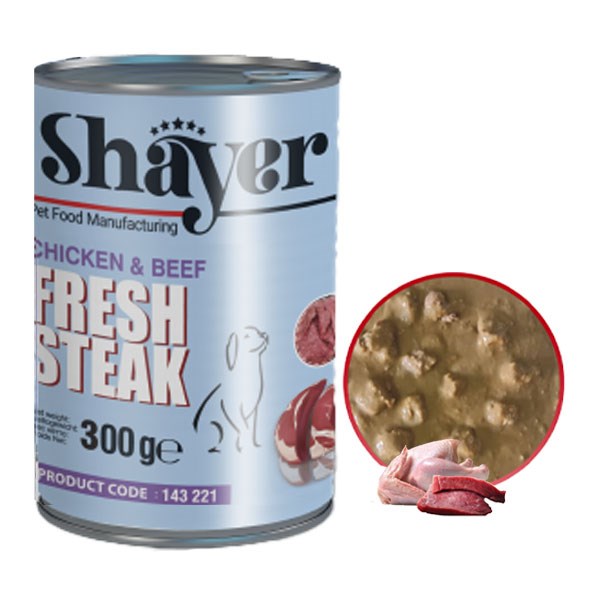 کنسرو استیک سگ شایر طعم مرغ و گوشت قرمز - وزن (300 گرم)