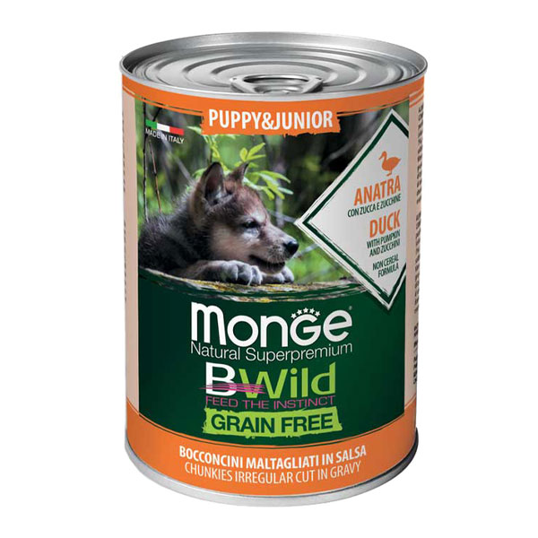 کنسرو توله سگ مونژه Bwild با طعم اردک و کدو تنبل و کدو سبز - وزن (400 گرم)