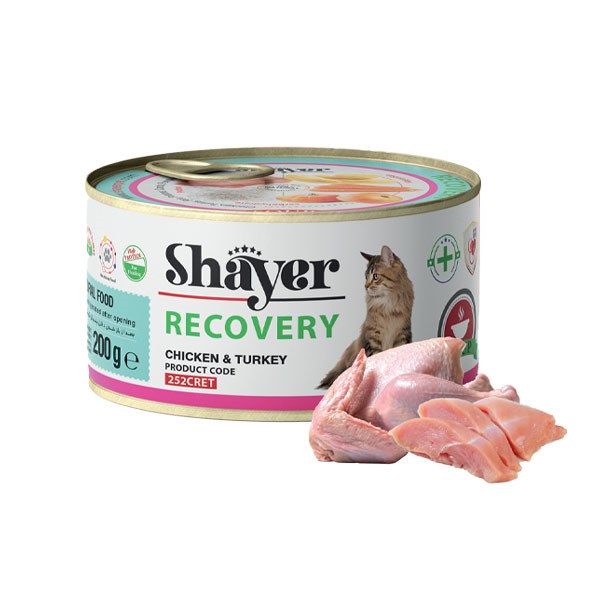 کنسرو ریکاوری گربه شایر حاوی مرغ و بوقامون غذای رژیمی برای بهبود سلامت تغذیه در طول دوران نقاهت و یا در موارد چرب بودن کبد گربه تهیه شده است. این غذا دارای انرژی بالا و غلظت بالایی از عناصر غذایی است که قابلیت هضم زیادی دارند. این کنسرو ریکاوری گربه Shayer دارای محتوای انرژی زیاد و طعم فوق العاده است که به جبران کاهش تغذیه و کاهش اشتهای حیوان شما کمک می کند. وجود اسیدهای چرب امگا3 (EPA و DHA)، به یکپارچگی مخاط روده کمک می کند.