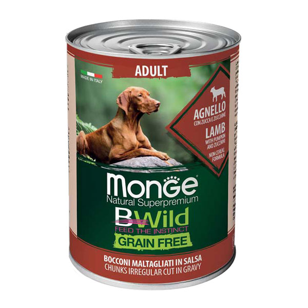 کنسرو سگ مونژه Bwild با طعم گوشت بره و کدو تنبل و کدو سبز - وزن (400 گرم)