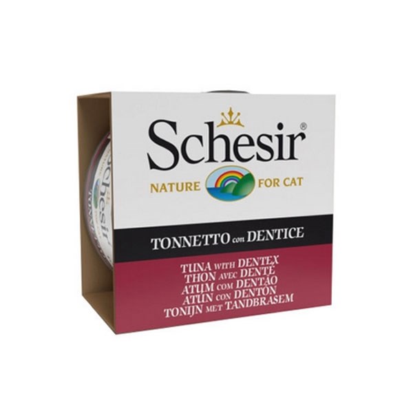 کنسرو غذای گربه شسیر با طعم ماهی تن و دنتکس Schesir Tuna With Dentex بصورت 100% طبیعی تولید شده است.